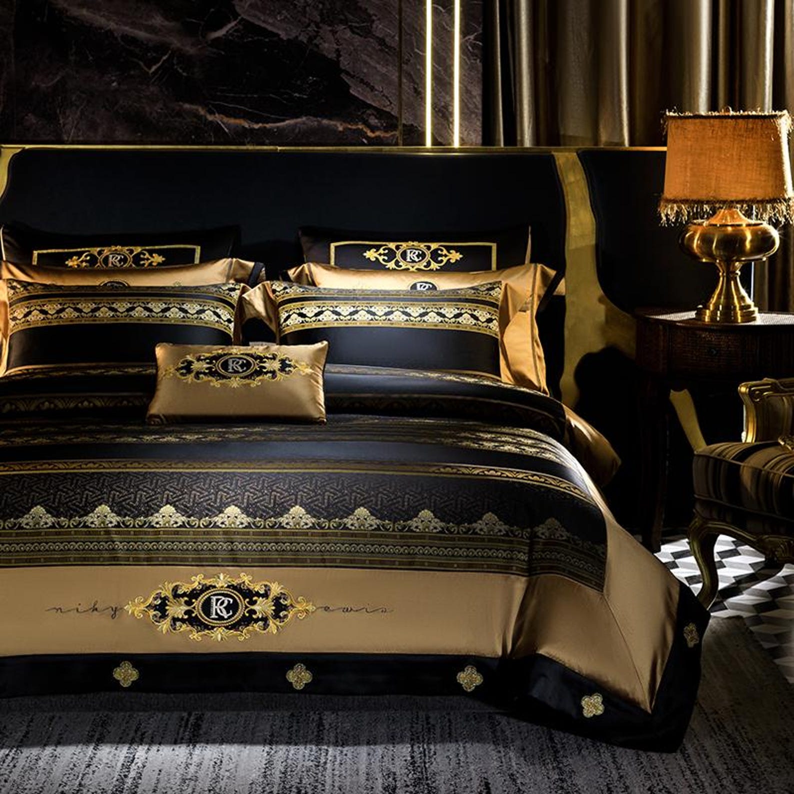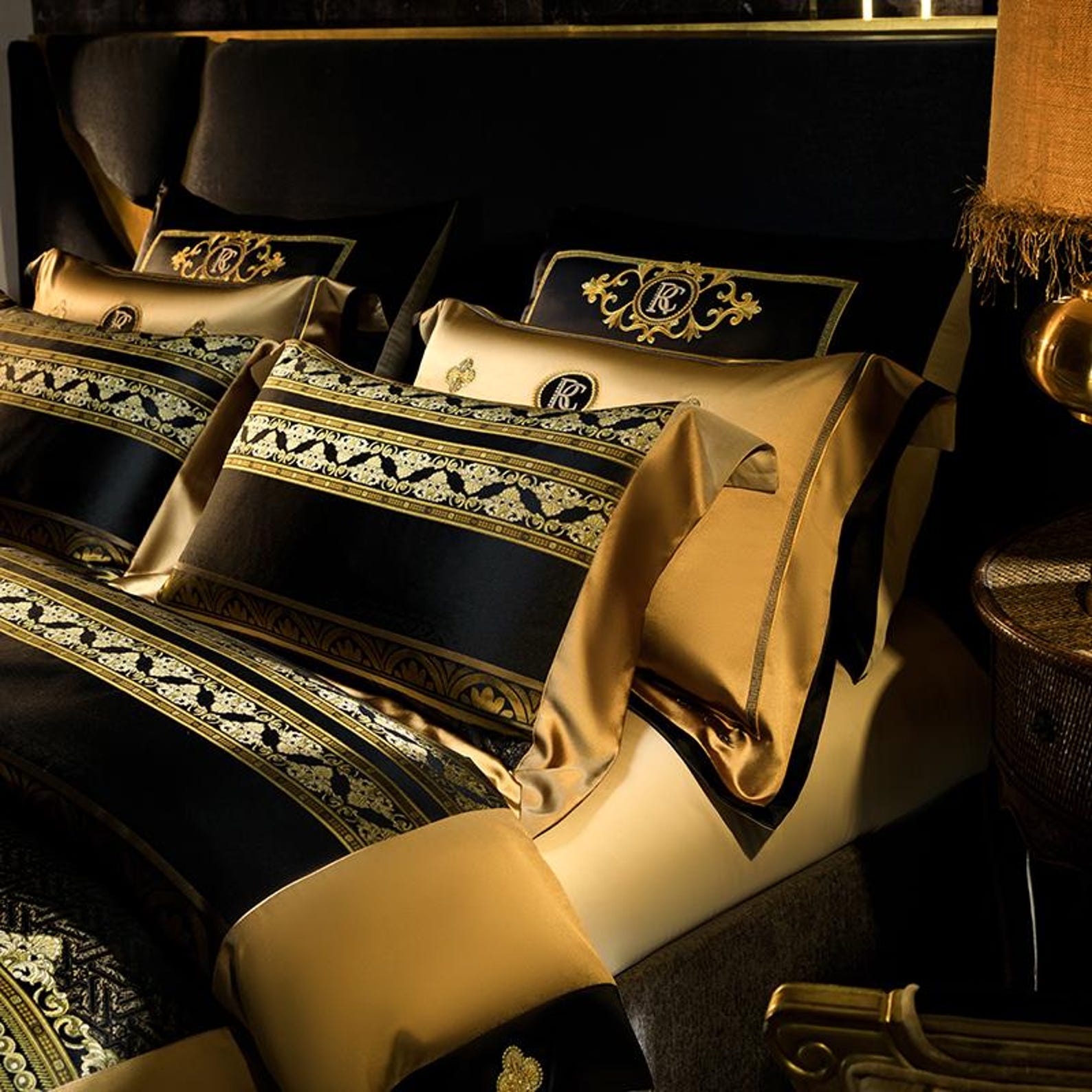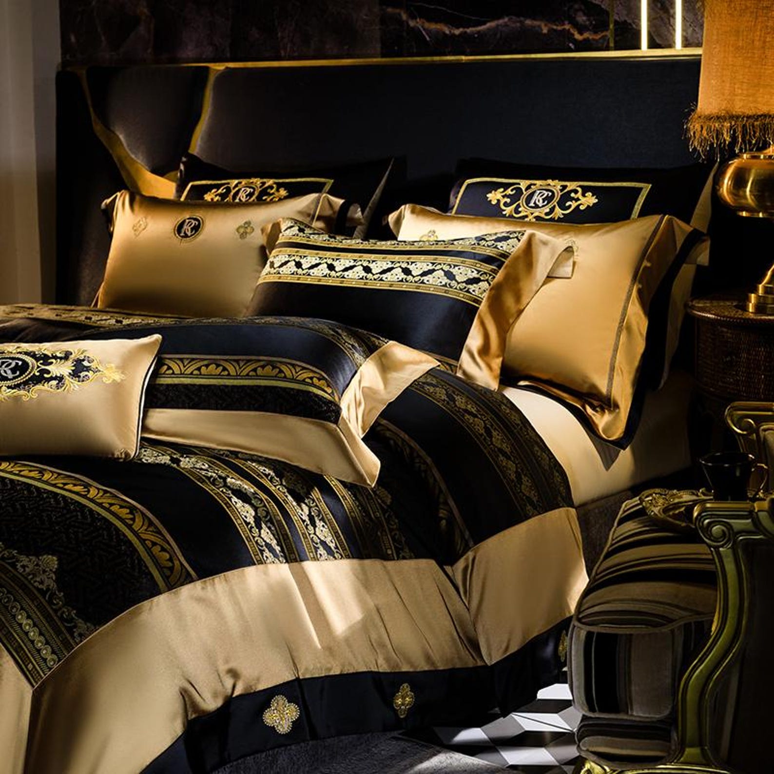 Elevate your bedroom into a palace of grandeur with this opulent four-piece bedding set. Designed in deep black with rich gold accents, it embodies regal sophistication and timeless elegance. Perfect for those who appreciate bold, statement-making interiors.