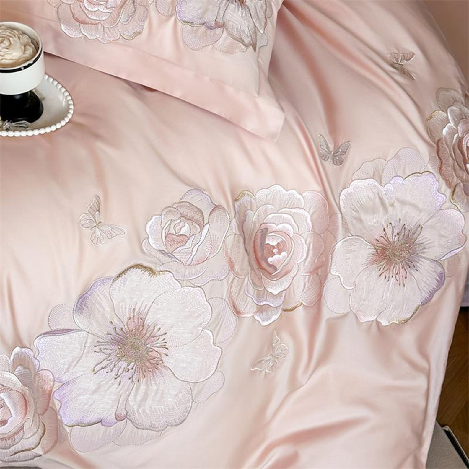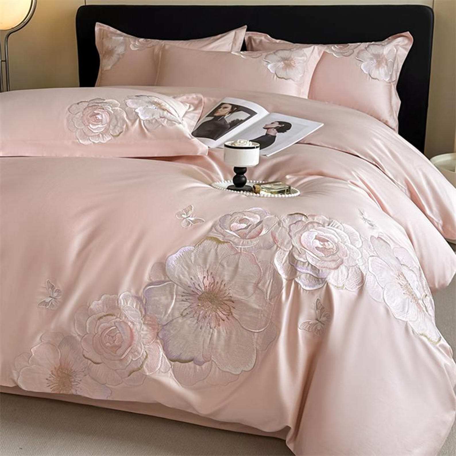 Bring elegance and romance into your bedroom with this stunning four-piece bedding set. Designed in a graceful blush pink tone and adorned with intricate floral embroidery, it creates a luxurious yet soothing atmosphere. Perfect for those who appreciate refined beauty, this set blends comfort with artistry for a timeless bedroom upgrade.