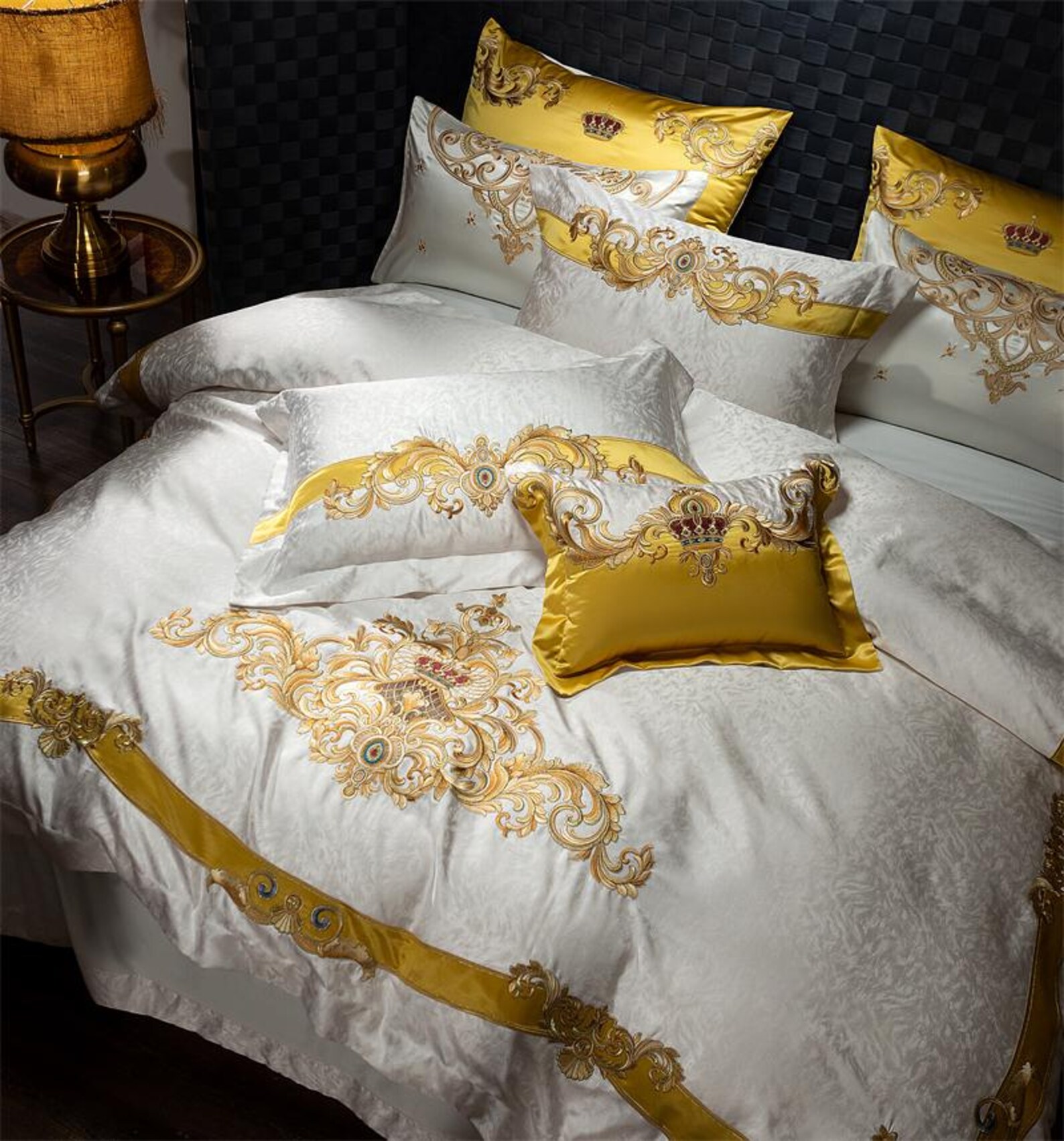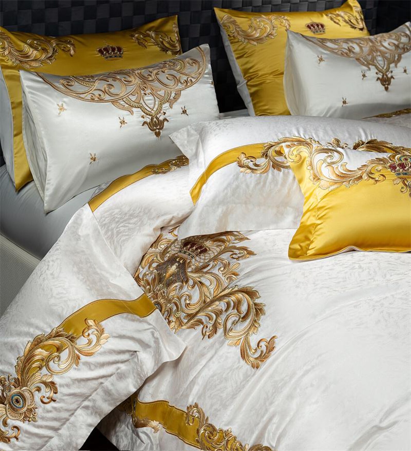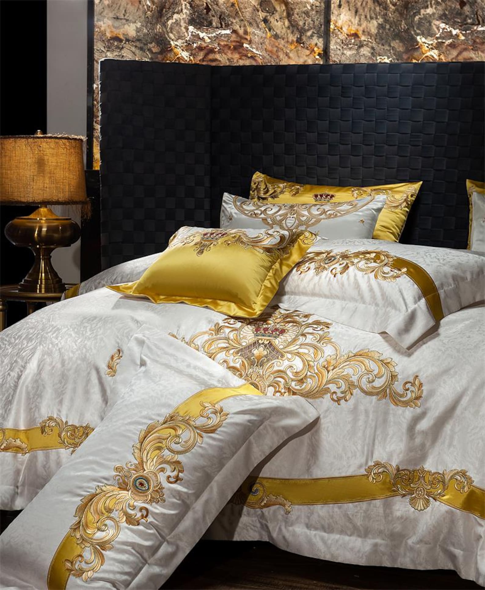 Transform your bedroom into a palace of elegance with this exquisite four-piece bedding set. Featuring intricate golden embroidery, regal crown motifs, and a lustrous satin-like finish, it radiates opulence and sophistication. Perfect for those who appreciate grandeur and timeless beauty, this set adds a touch of royal luxury to your space.