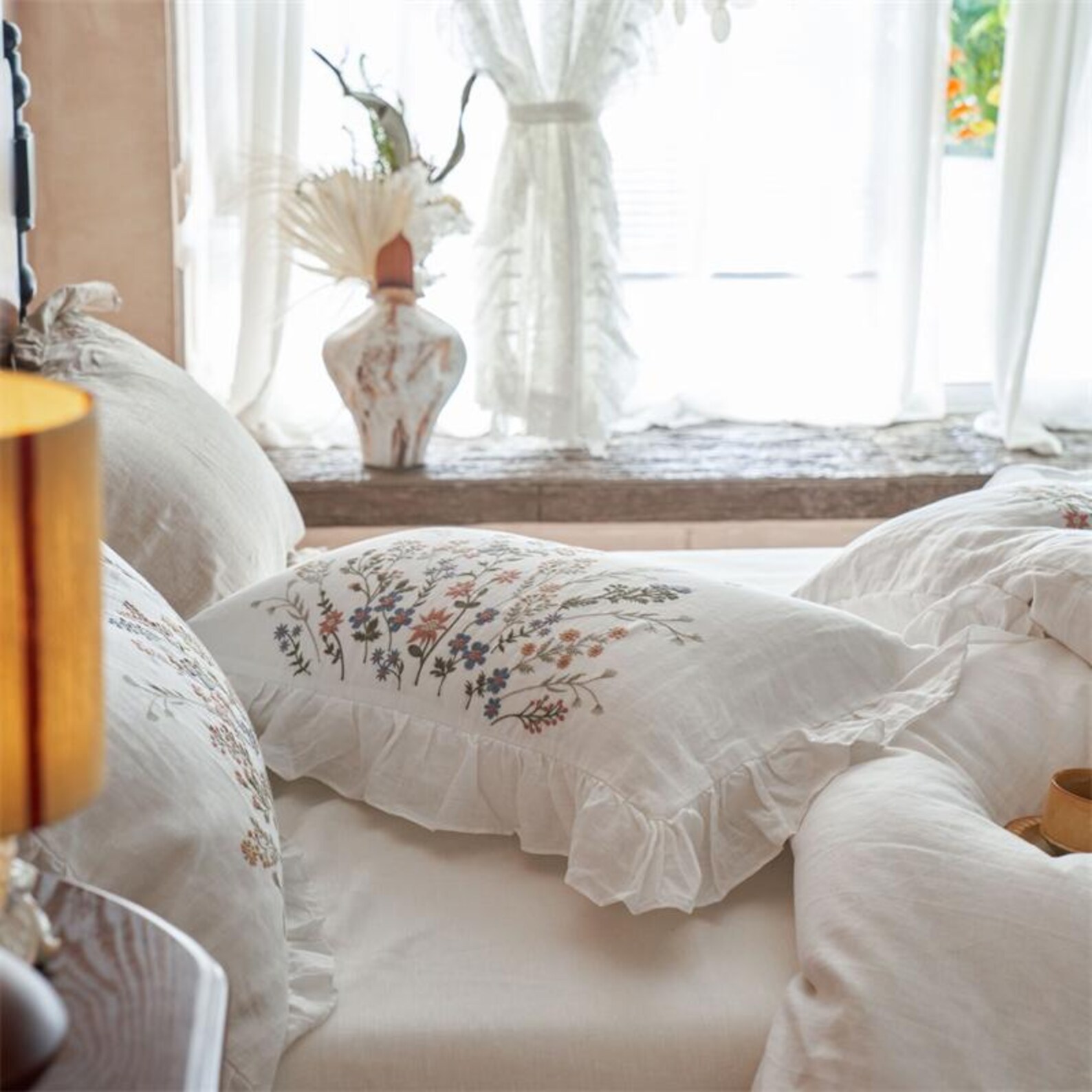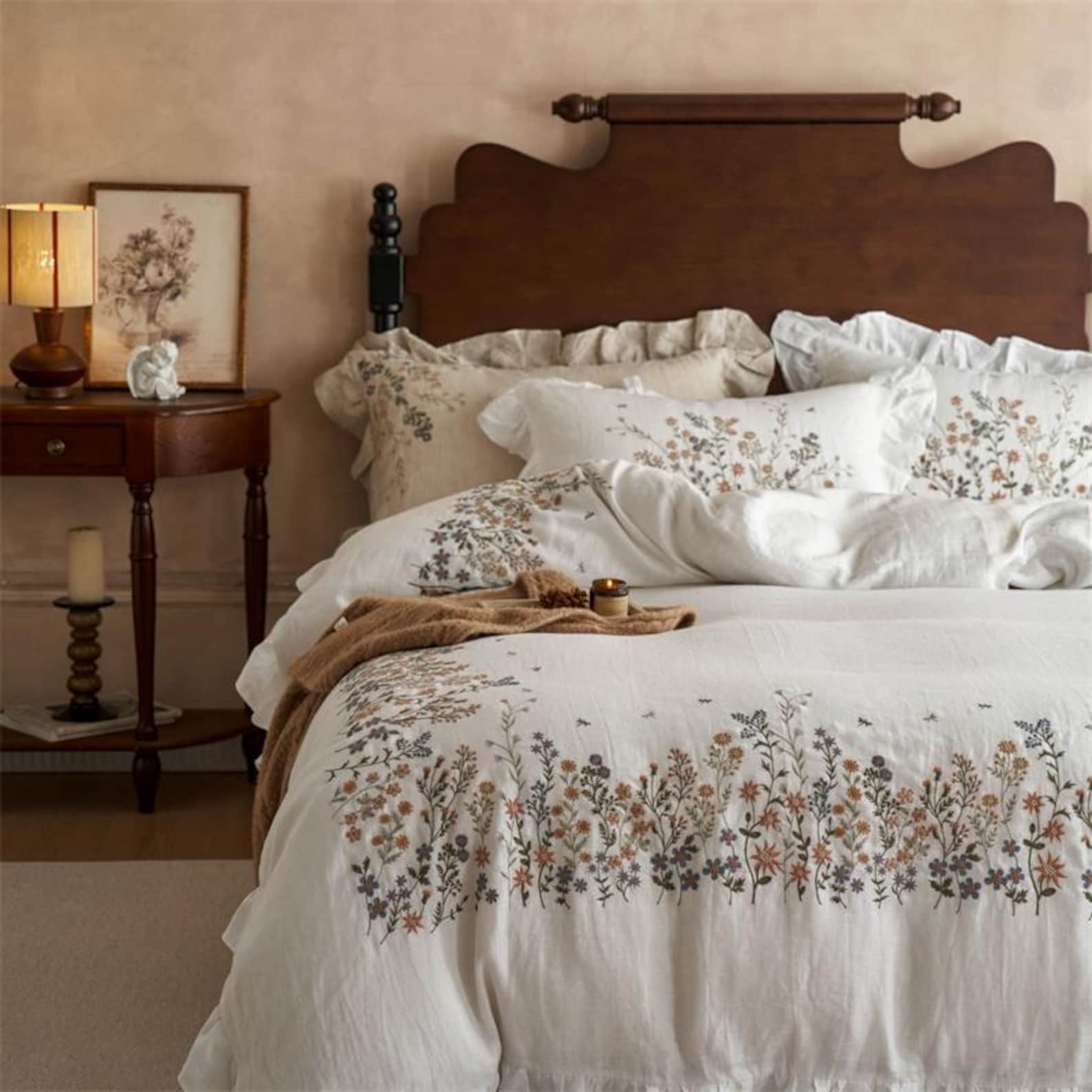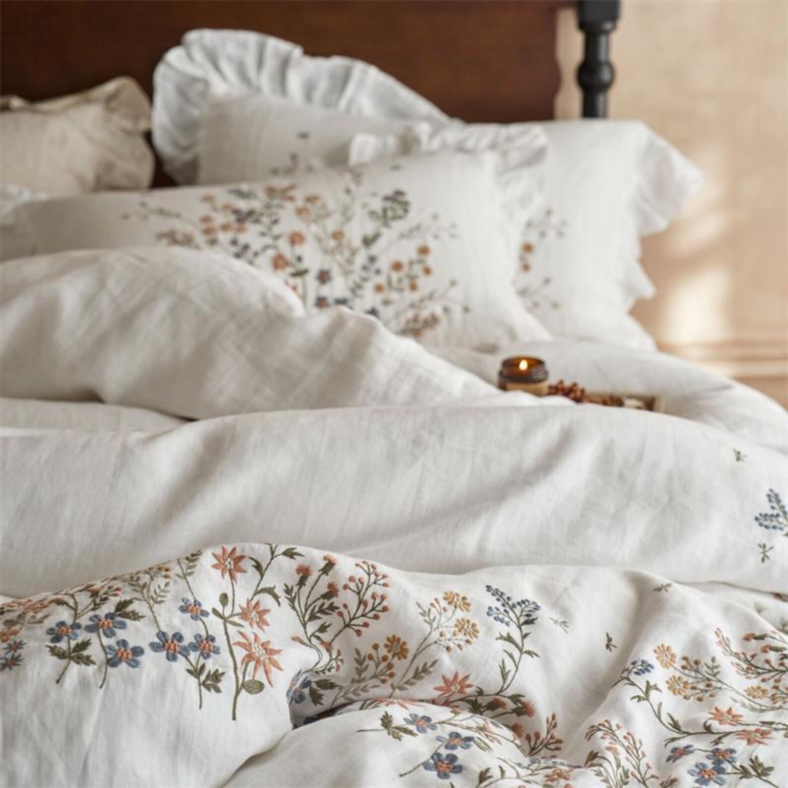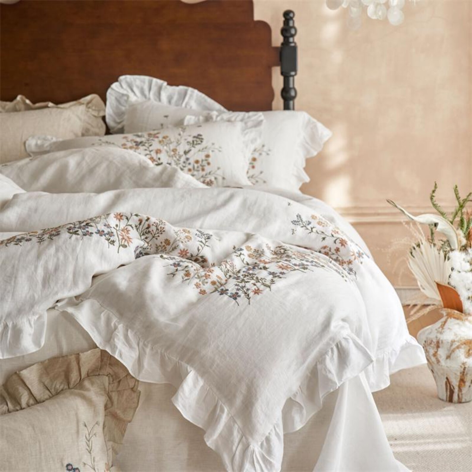 Bring the charm of nature indoors with this four-piece bedding set, featuring delicate wildflower embroidery across a soft white base. With earthy tones and romantic ruffle details, it creates a cozy, cottage-inspired retreat that balances rustic simplicity with timeless elegance.